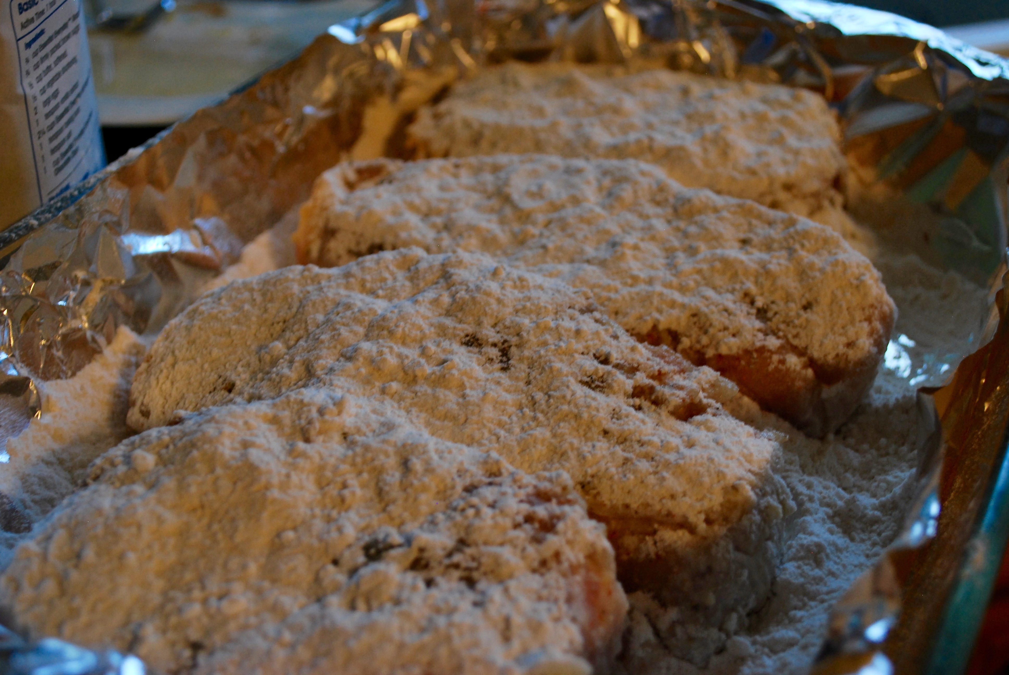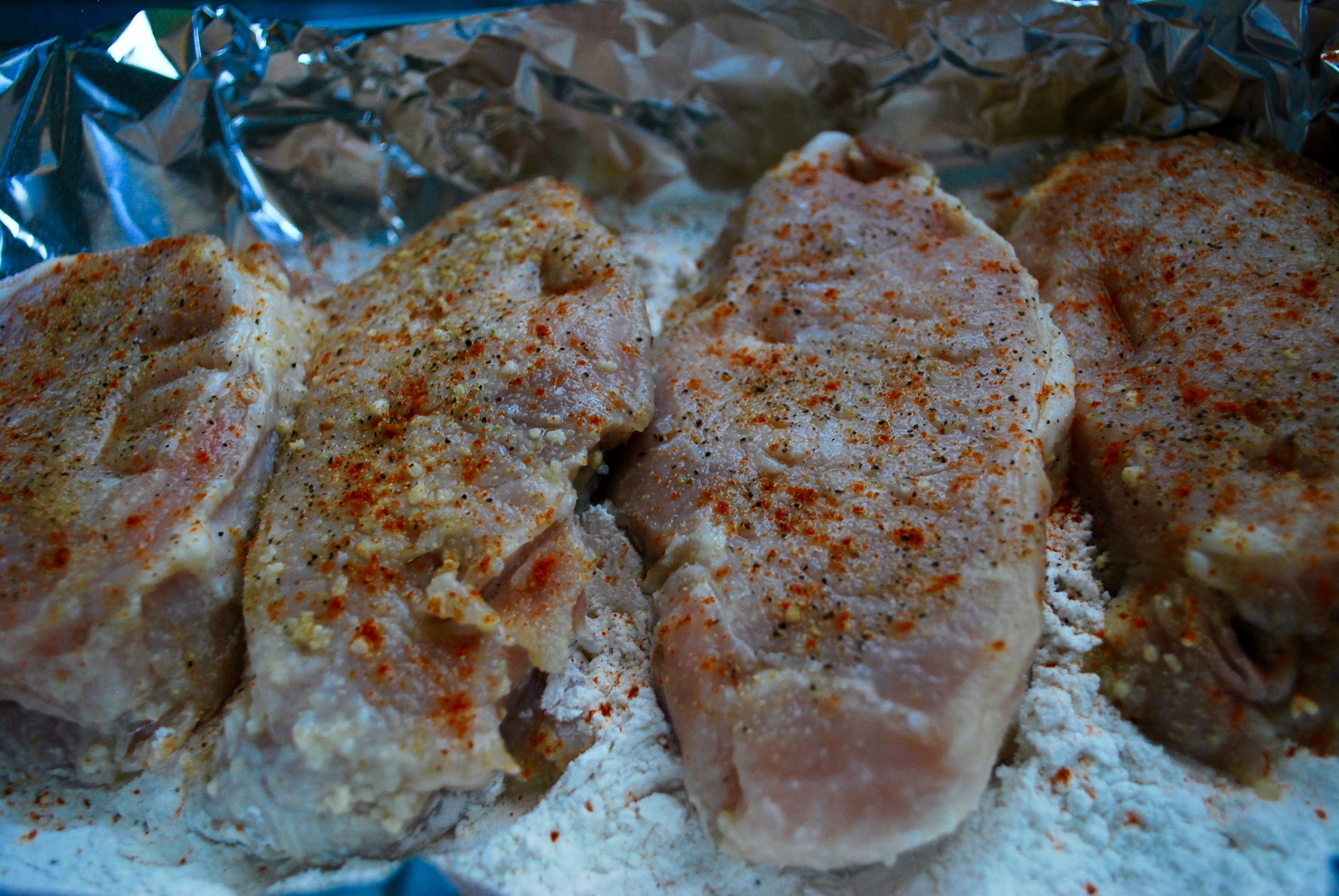 - Line a large baking dish with aluminum foil and spread 1 cup of flour evenly across it. Place Pork Chops in the dish onto flour.