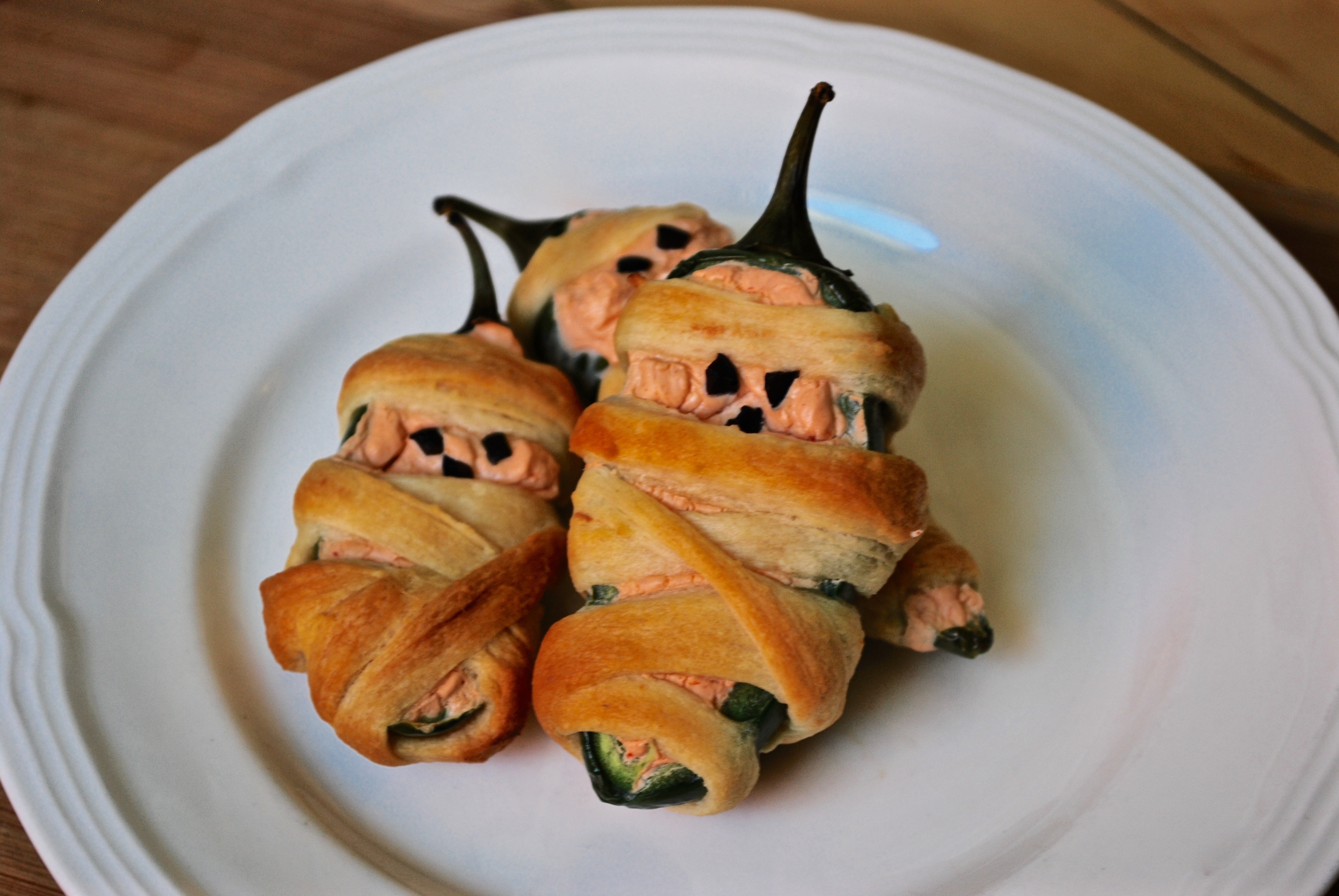 Halloween is coming! Which means lots of parties and candy! Instead of bringing the same snacks as everyone else try these! They are perfect for a Halloween party. Only a few ingredients and very simple to make. I added Sriracha sauce because I LOVE spicy food. However, I did clean out all the seeds from the jalapeños so that my mouth wasn’t on fire. If you want to make these kid friendly you can make half without Sriracha. Or just axe the Sriracha all together.