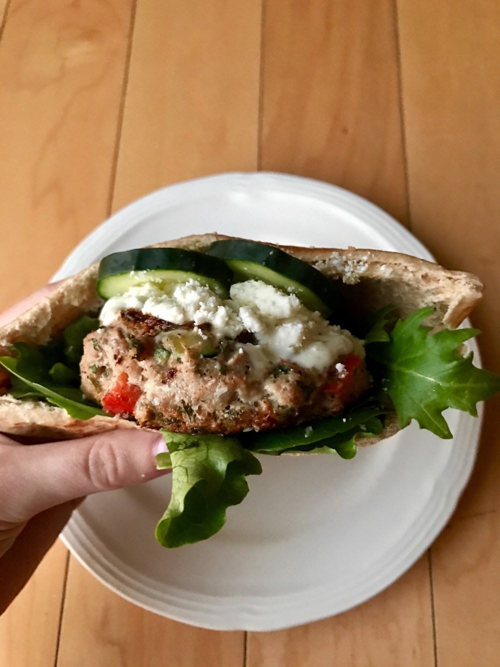 - In a pita pocket add arugula and drizzle with olive oil and salt. Then, add turkey burger and top with cucumber dill dressing, sprinkle feta, and top with cucumber slices.