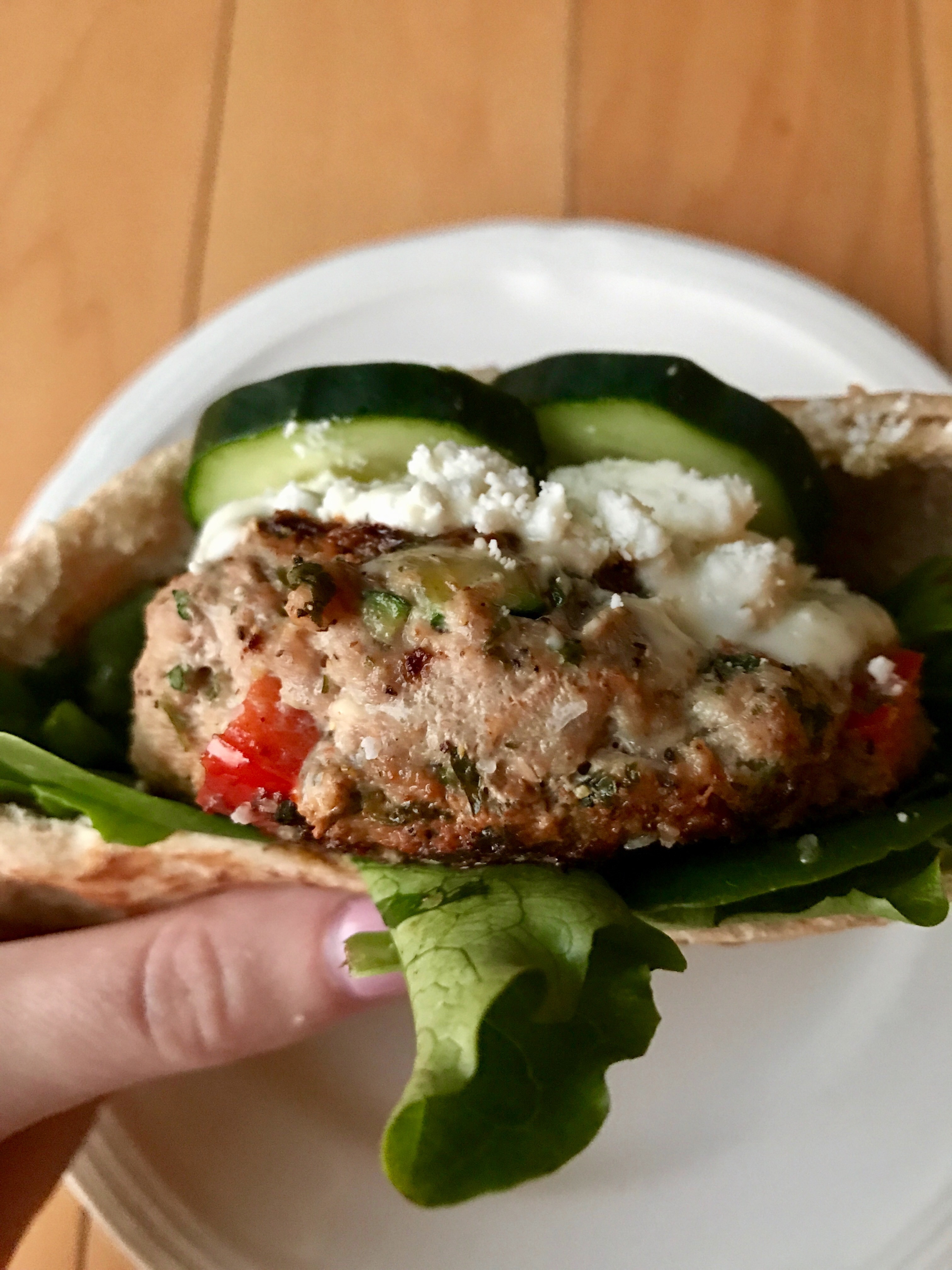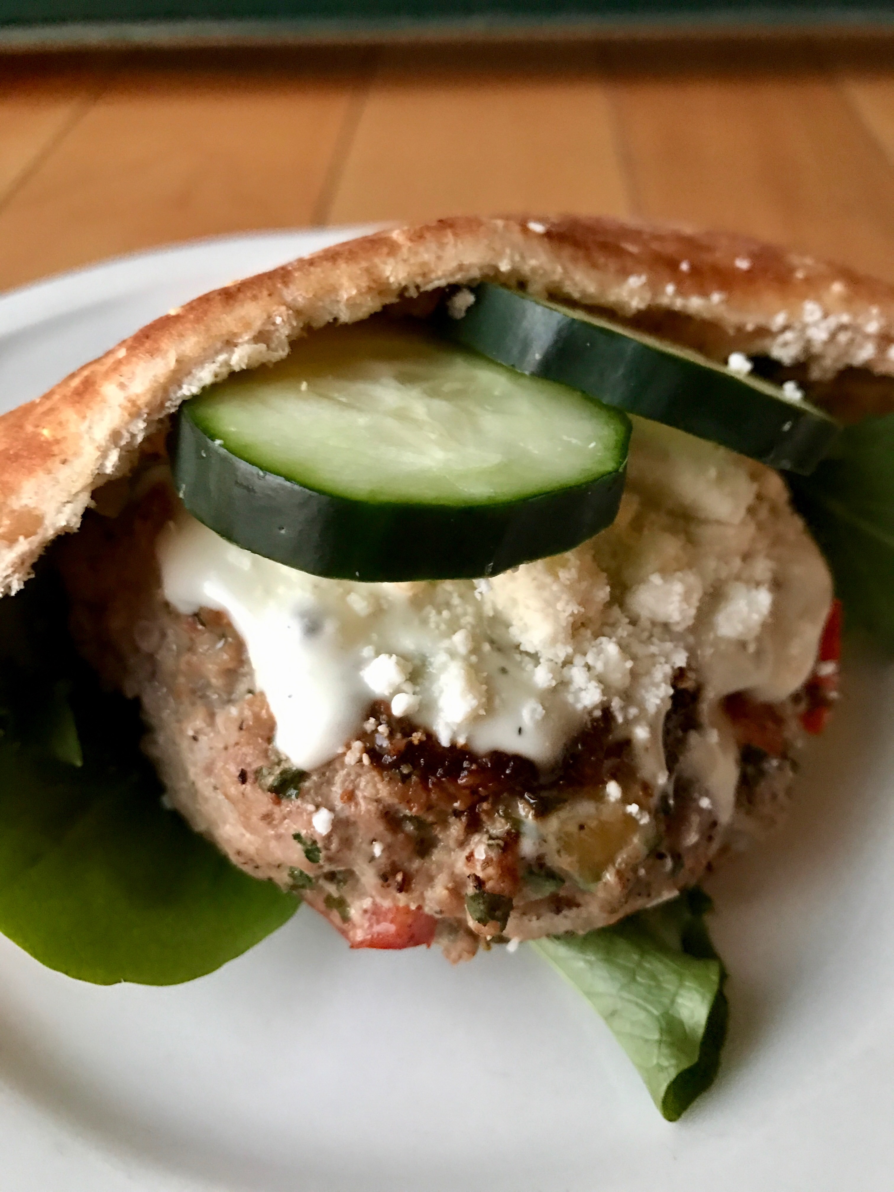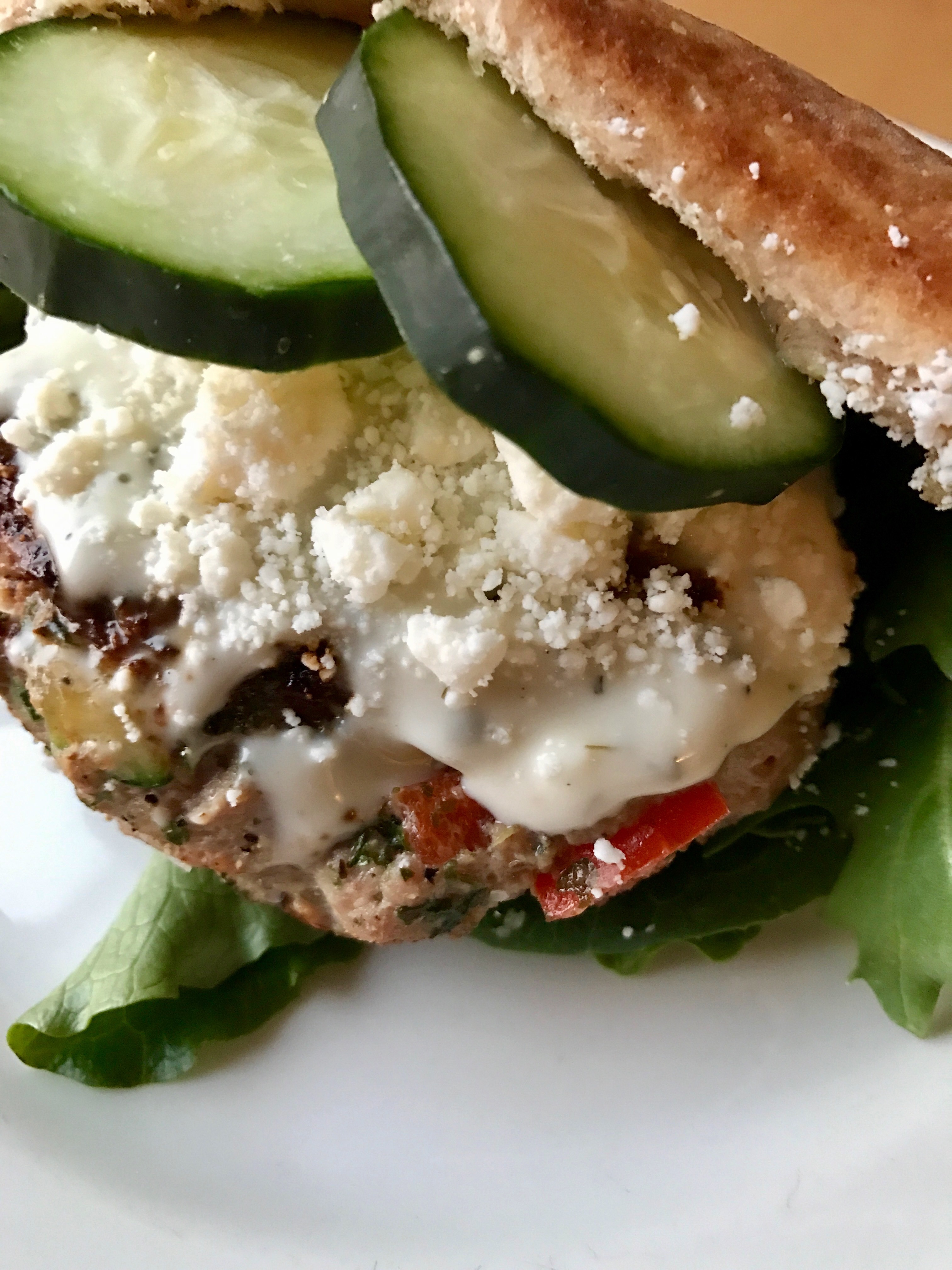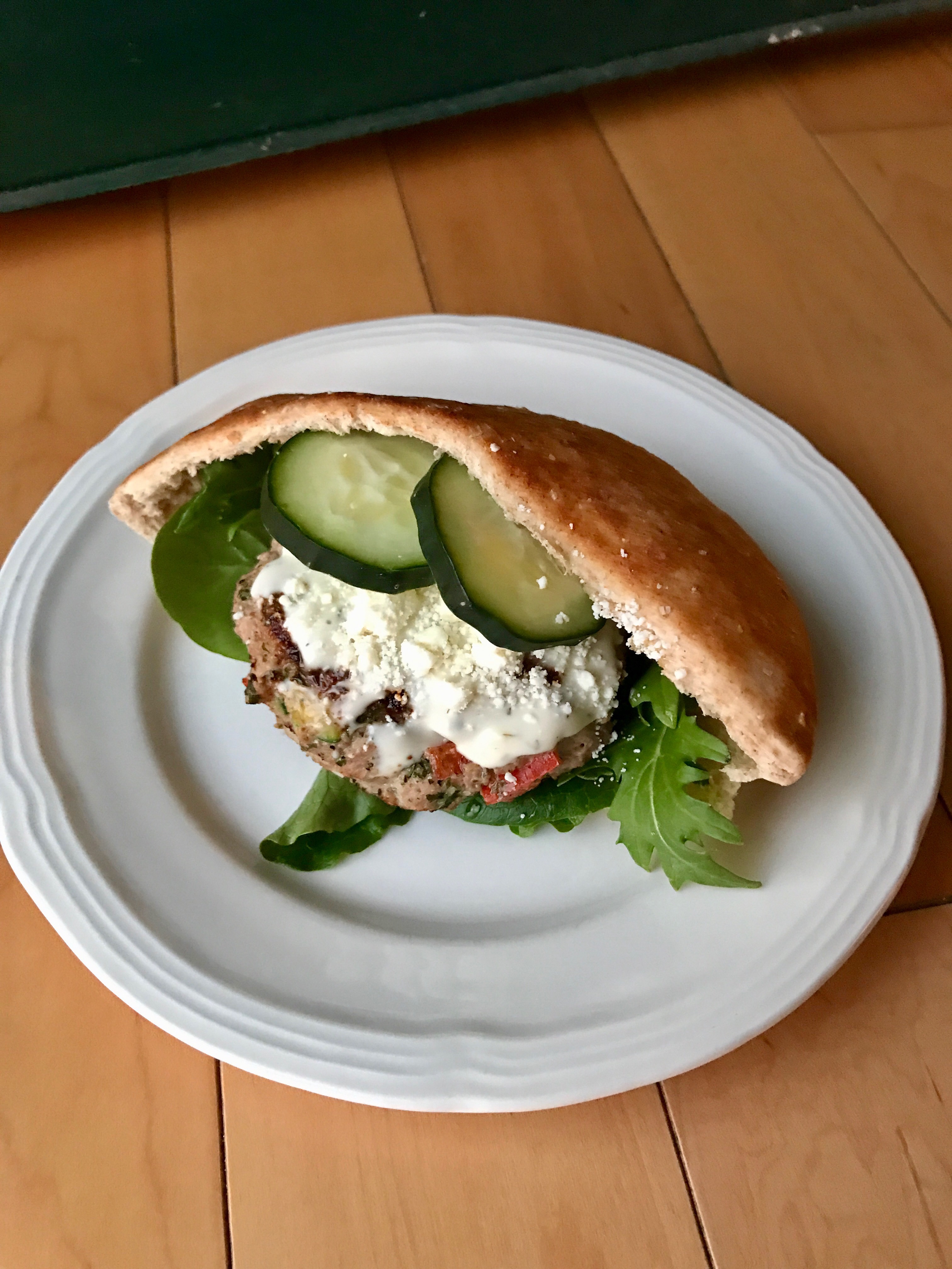 - In a pita pocket add arugula and drizzle with olive oil and salt. Then, add turkey burger and top with cucumber dill dressing, sprinkle feta, and top with cucumber slices.
