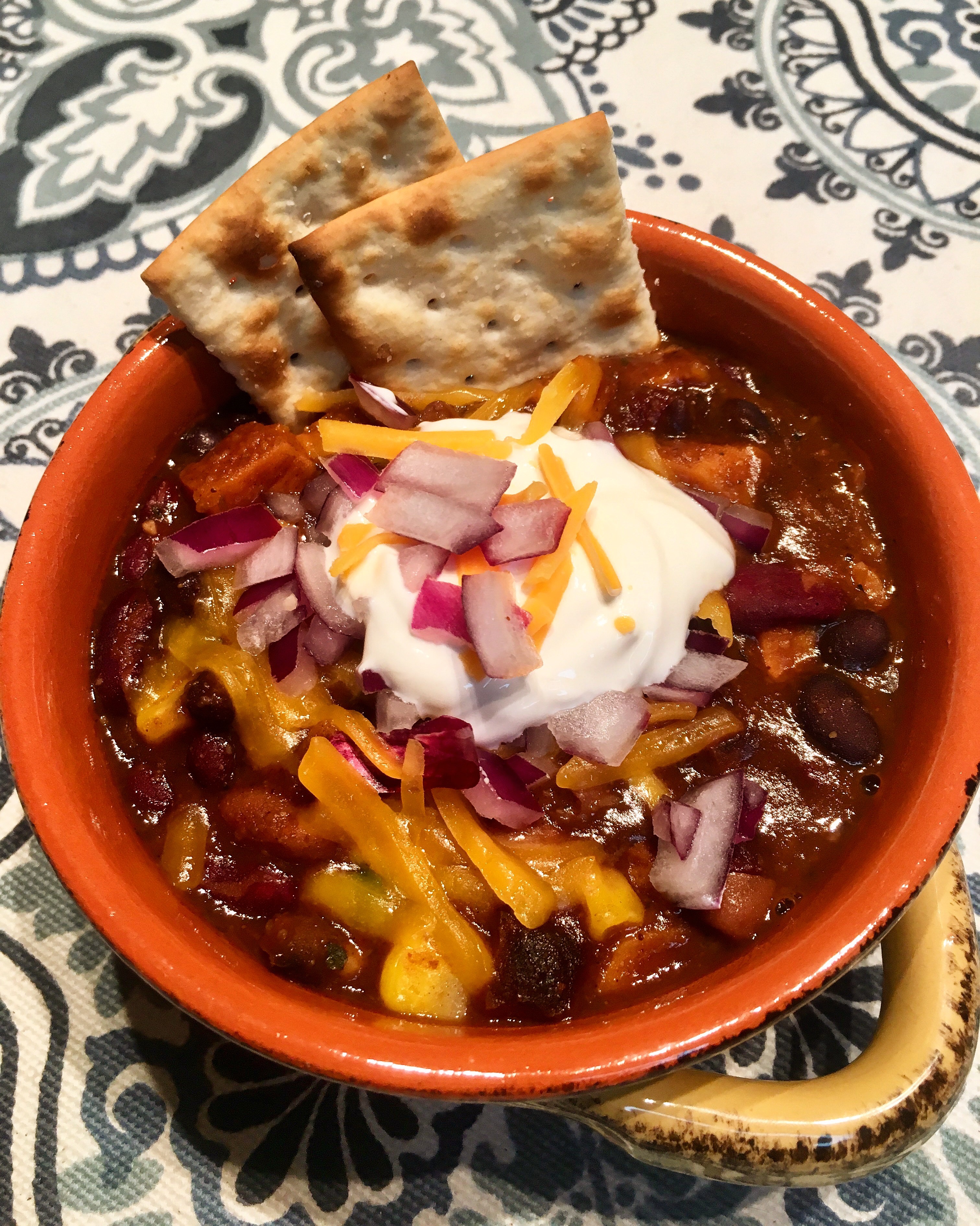 Okay, so after having a weekend full of studying and this cooler weather here (75 degrees is cold to me now lol) I wanted to make my easy chili recipe! But, I ended up added sweet potatoes in place of beef and it turned out amazing! So give this a try π