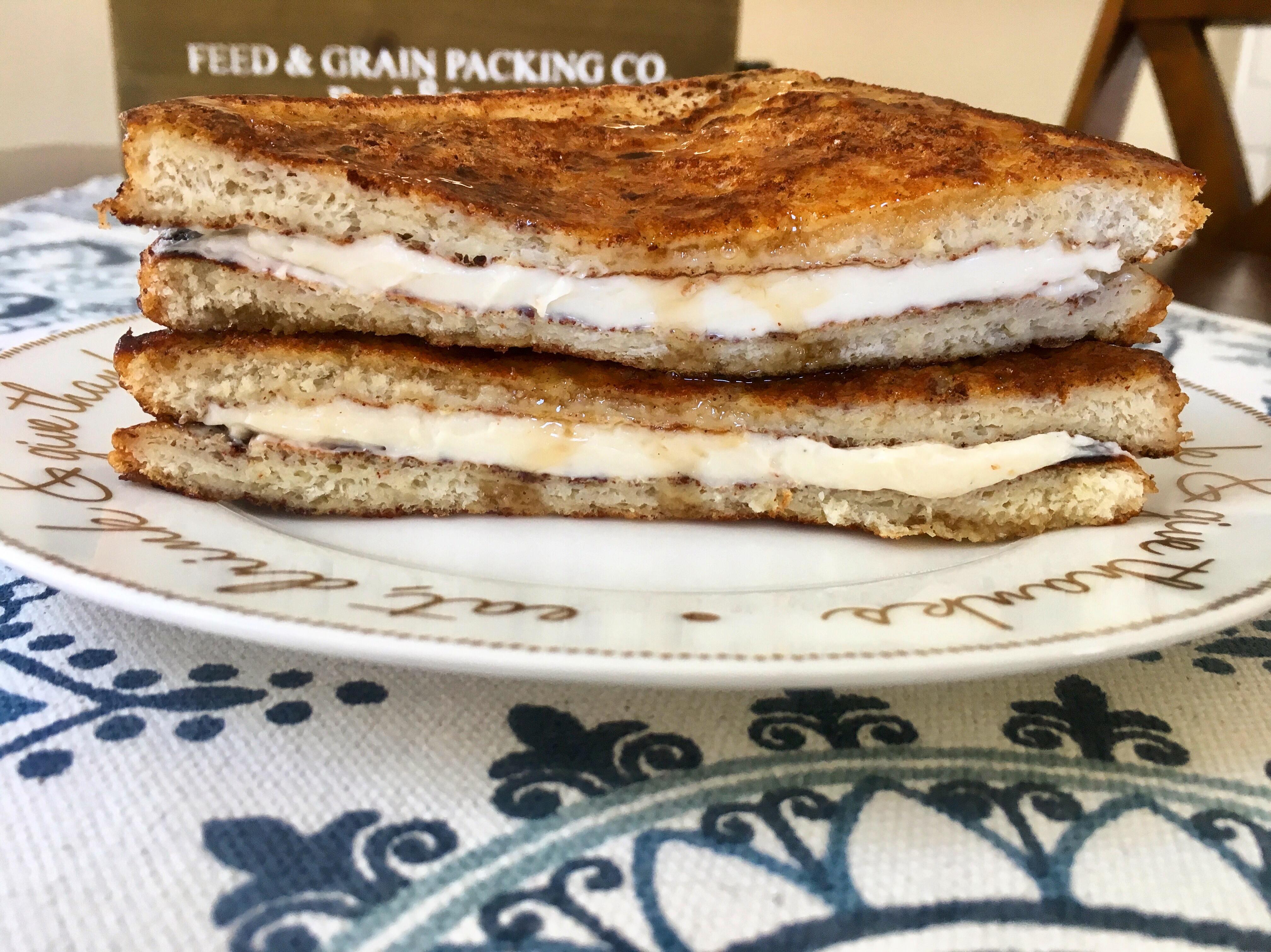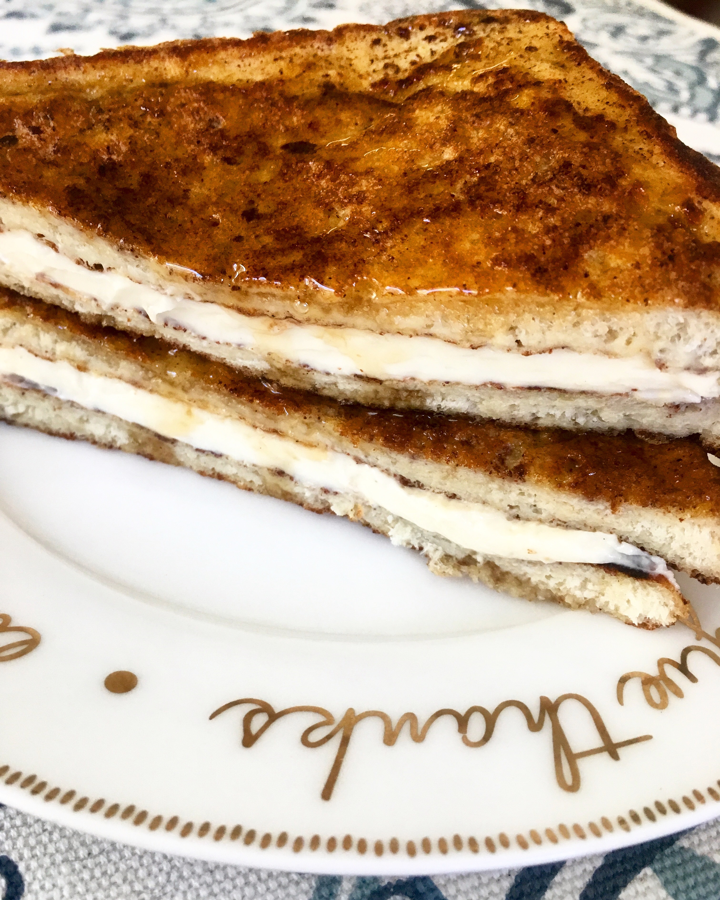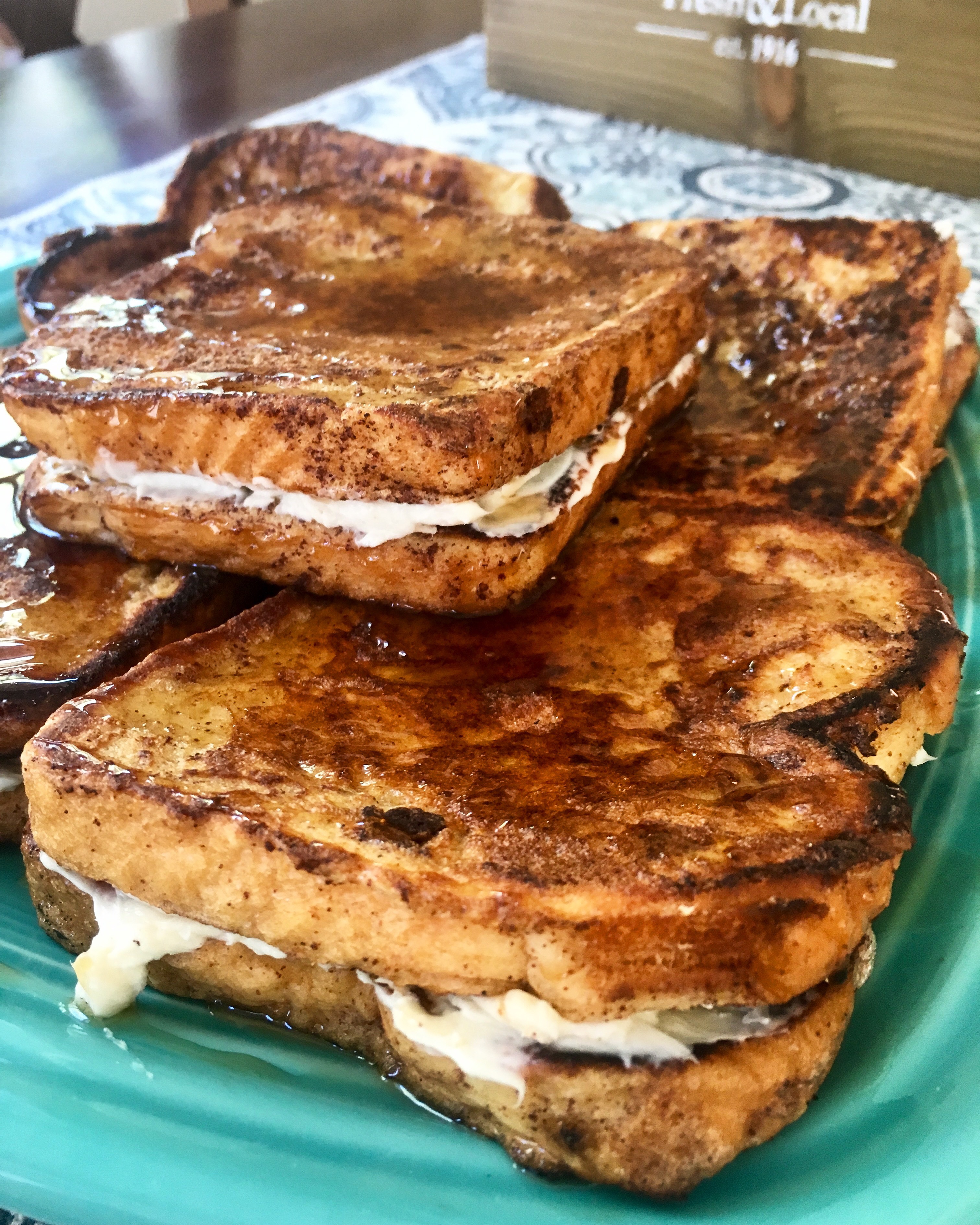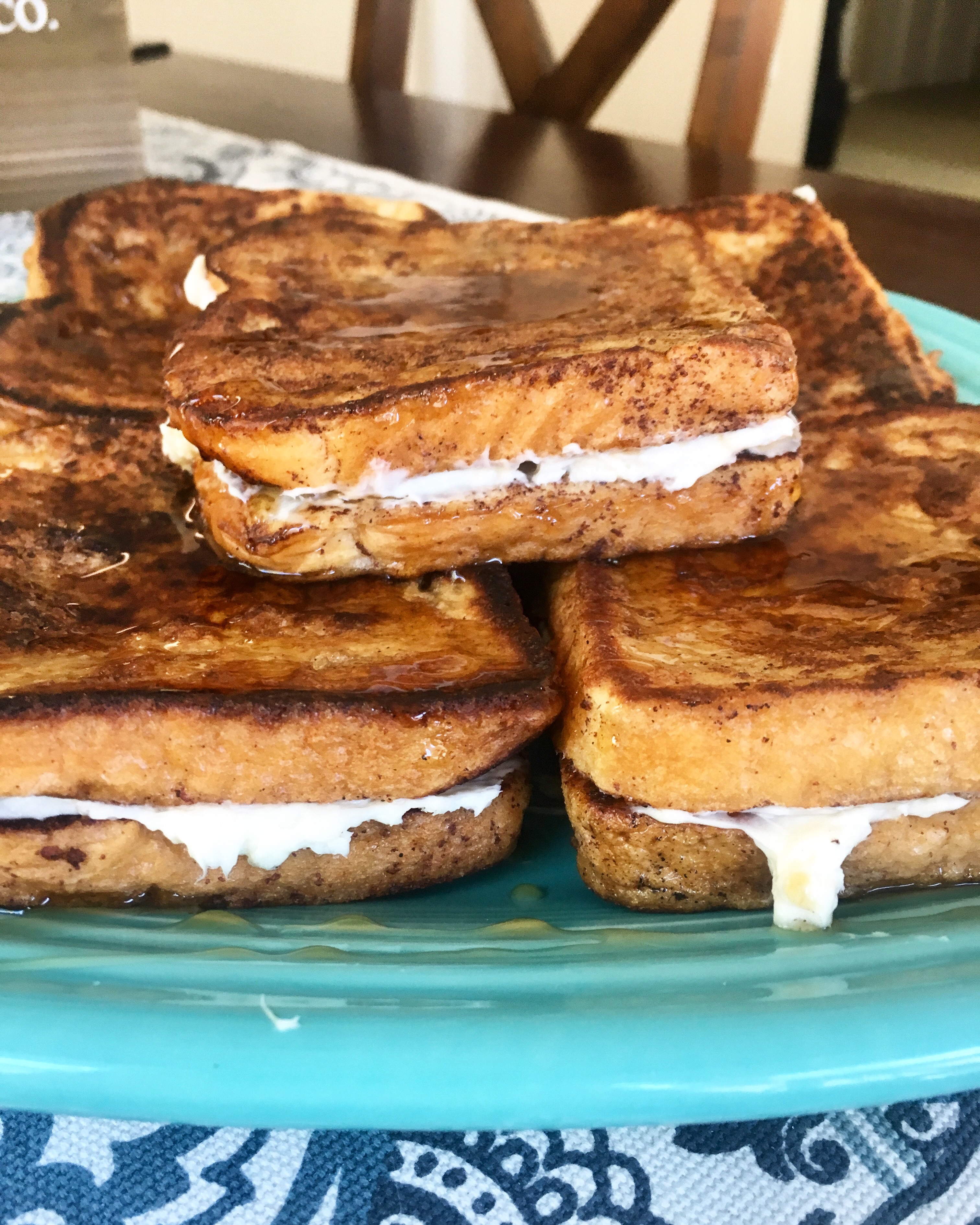 - Spread cheesecake mixture on each piece of French toast, stack 2 pieces of together.