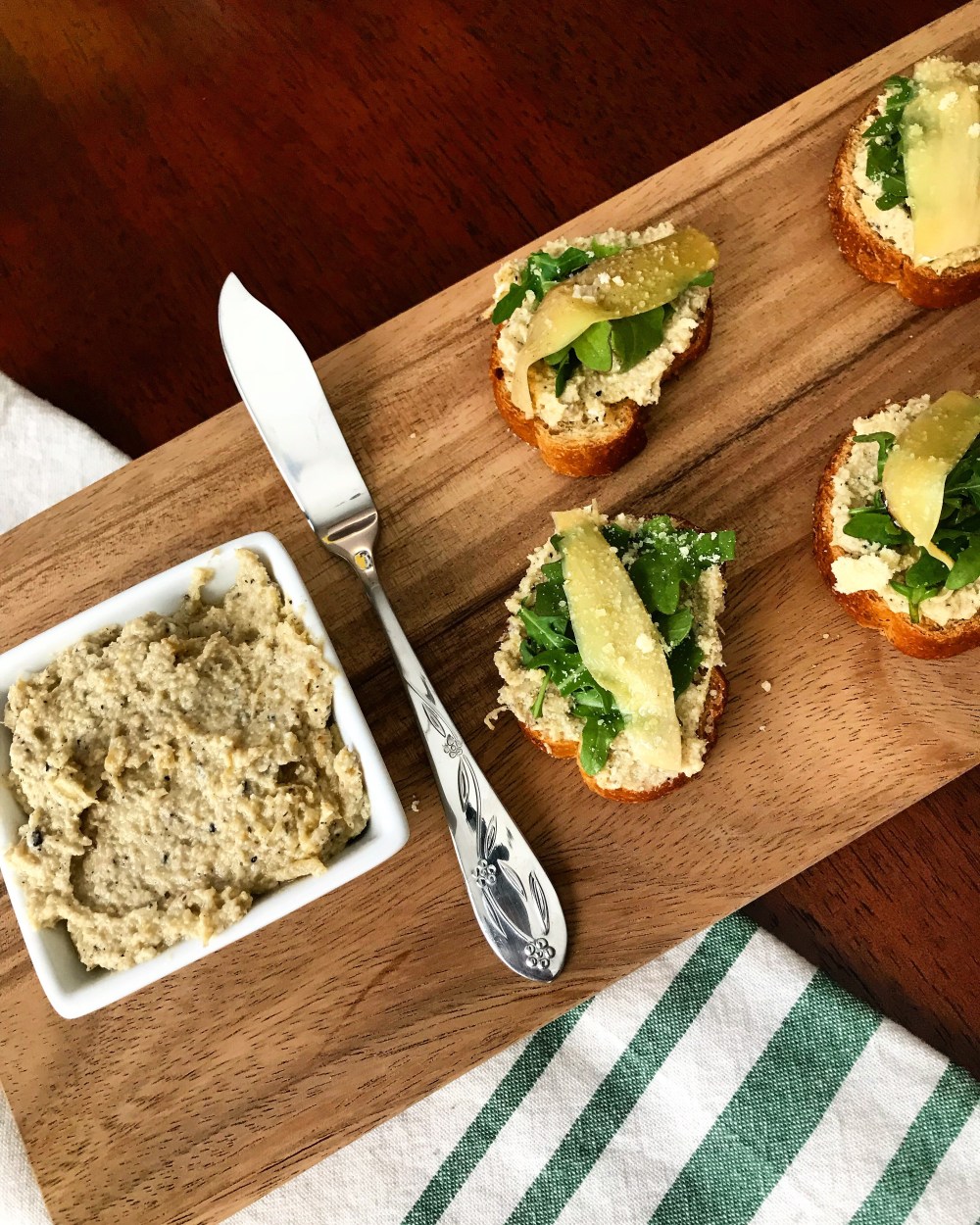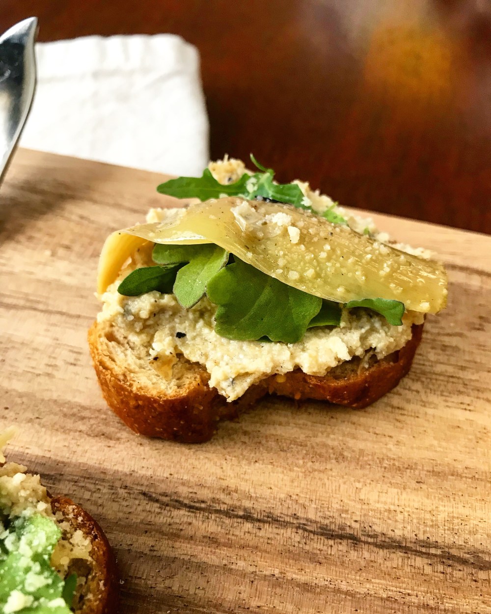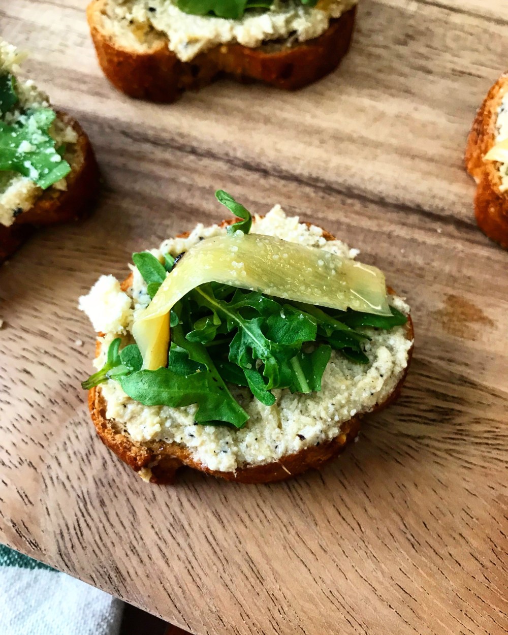 - Spread paste on top of bread slices and top with arugula and a piece of artichoke.