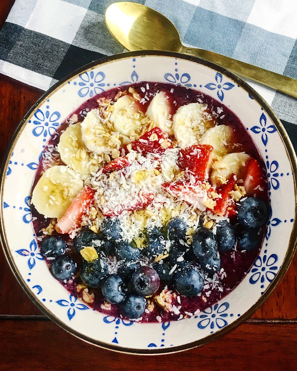 Happy Wednesday! I feel like I’m always saying how hot it is but…it’s so hot. It’s monsoon season here so it’s more humid than normal. Today I’d thought I’d share my favorite quick breakfast (or perfect snack to cool off). This smoothie bowl is made with fruits high in antioxidants, which helps protect your cells against free radicals in your body. Antioxidants are known to improve your heart health, skin, and immune system. Incorporating more antioxidants in your diet can improve your overall health!