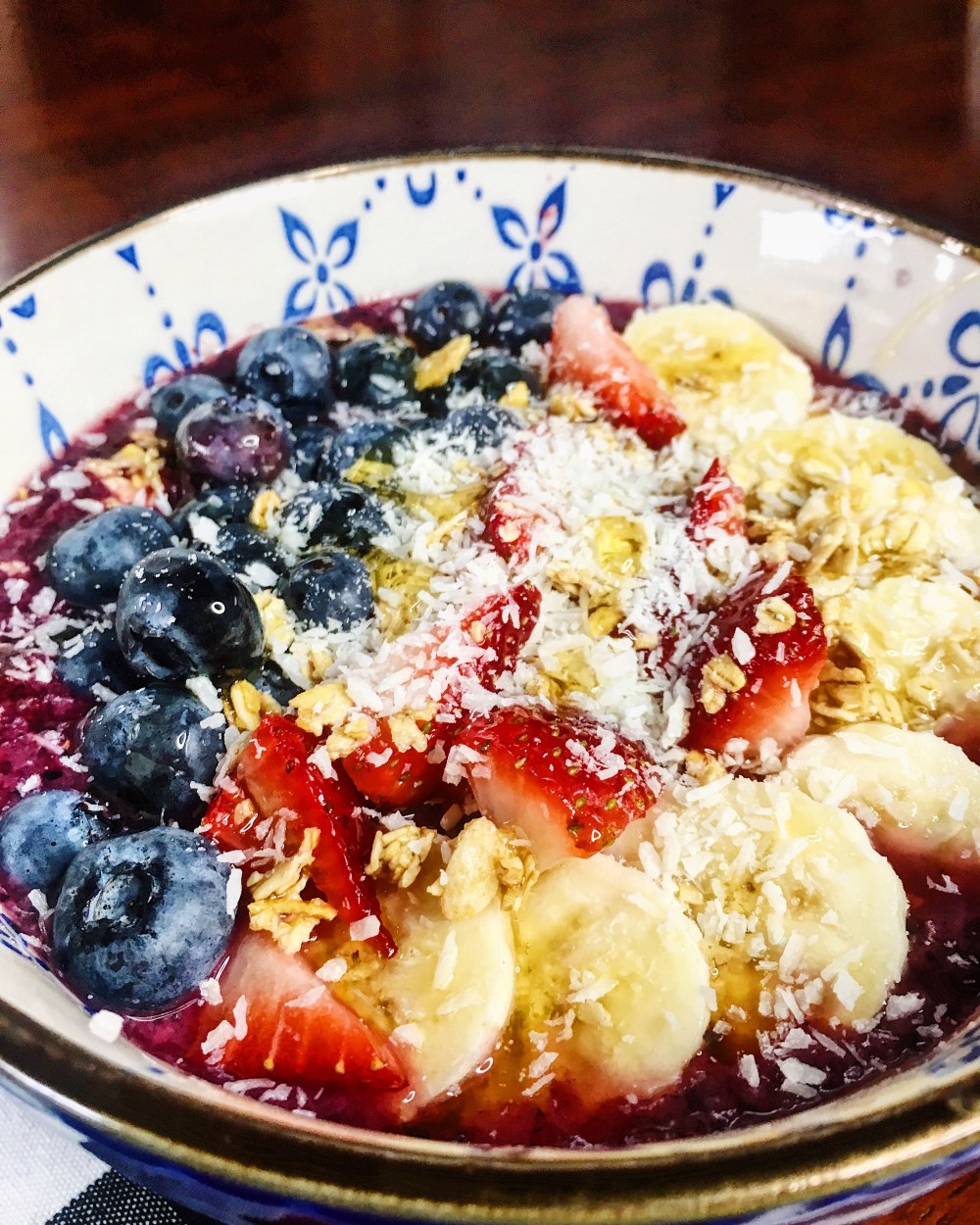 - Pour smoothie in a bowl and sprinkle granola on top (this helps the fresh fruit not to sink), top with fresh banana slices, strawberries, and blueberries. Sprinkle more granola and coconut on top. Drizzle honey over.