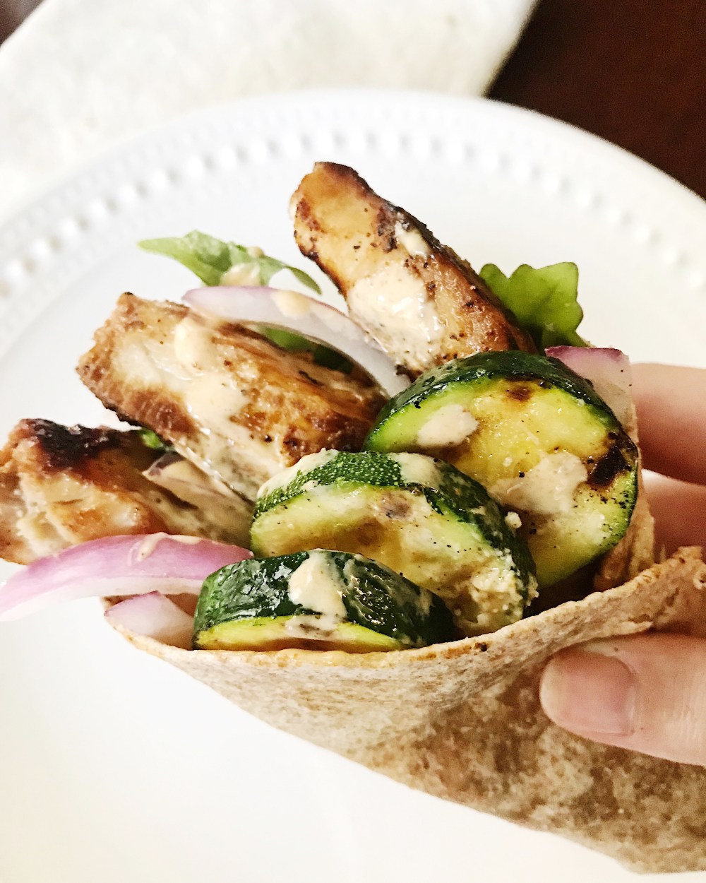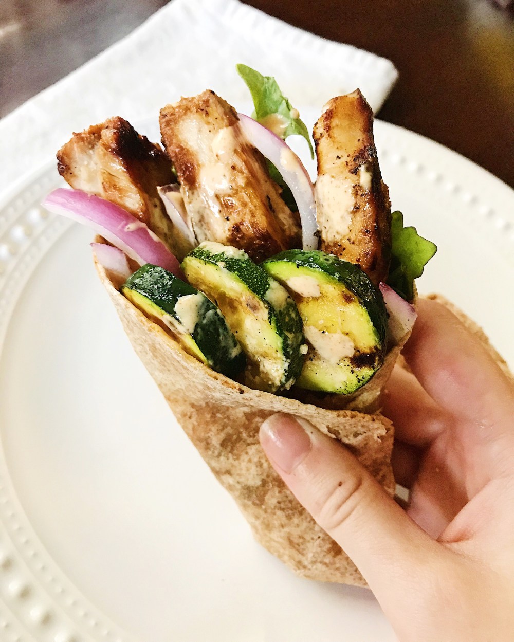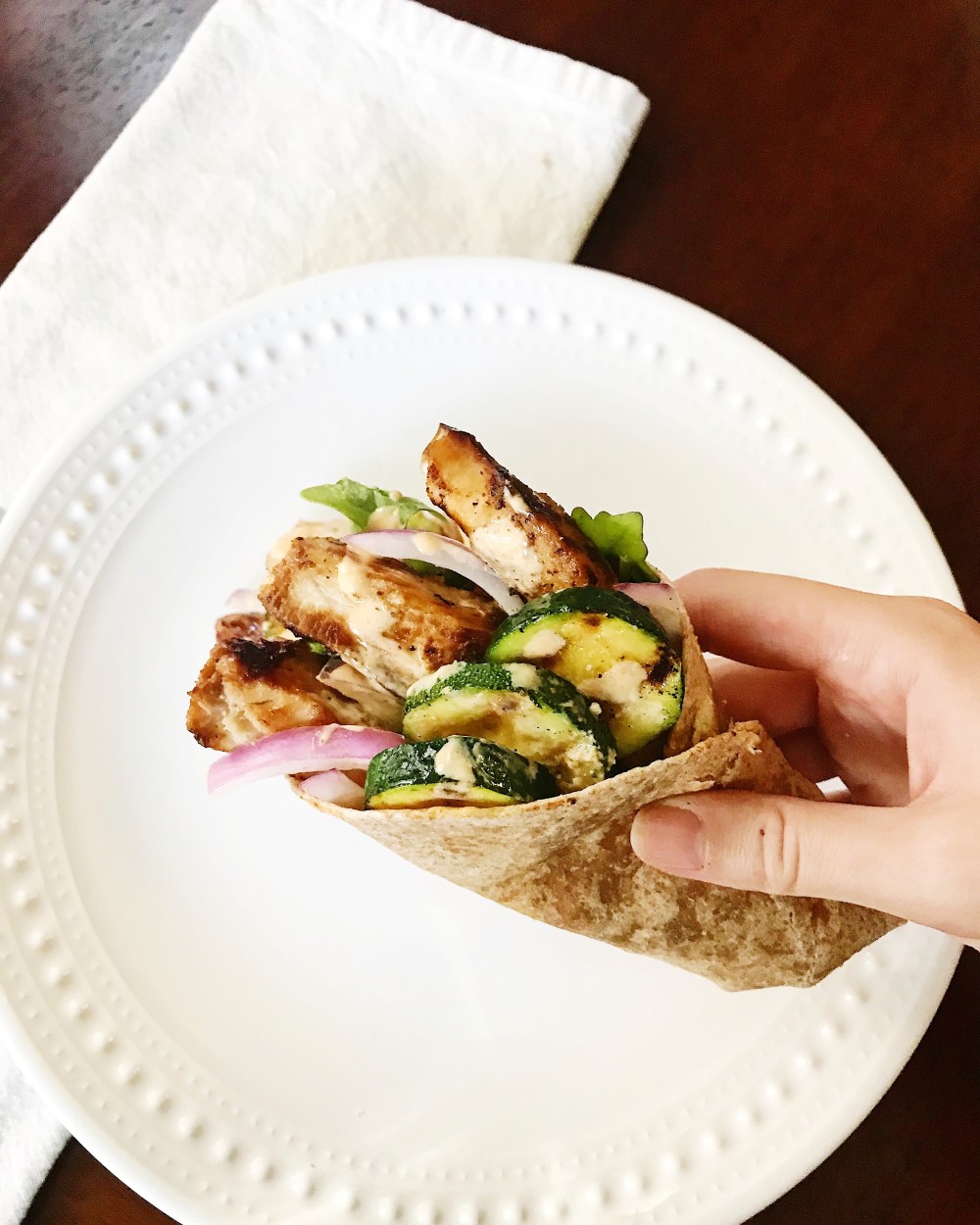 - Add arugula to tortilla and top with chicken, onion, and zucchini. Drizzle with lemon Aioli and wrap.