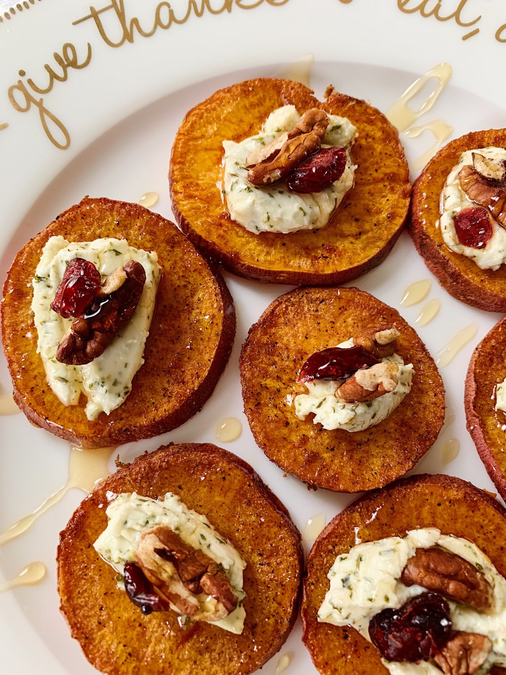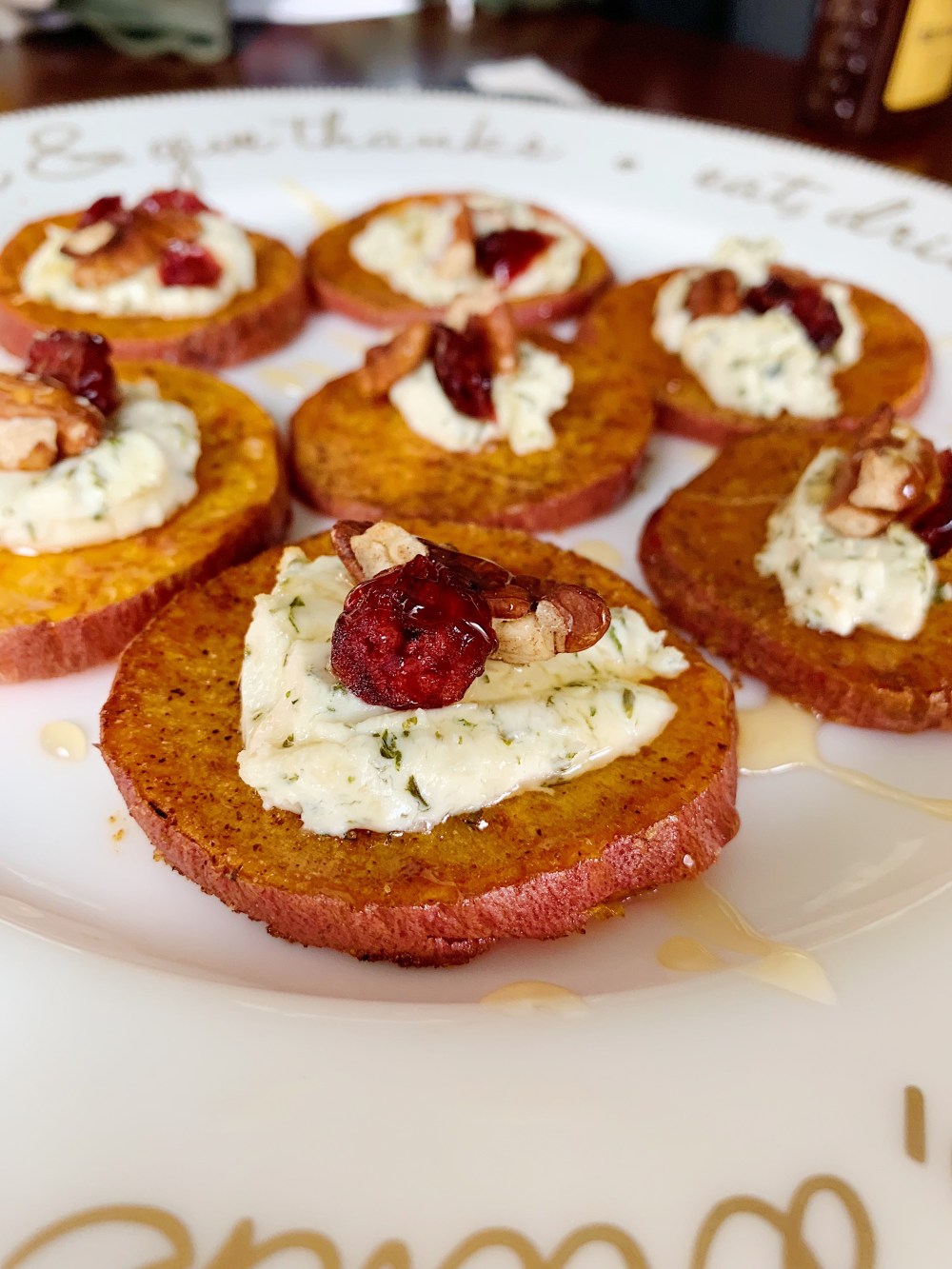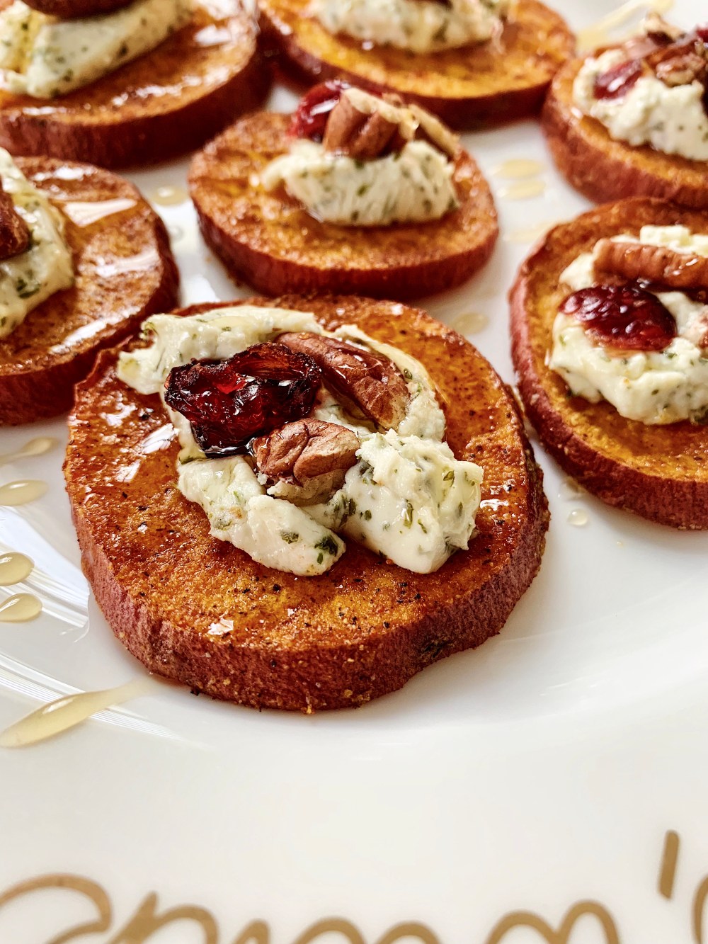 It has been a crazy few months. I can’t believe it’s November already. I’ve been working on some holiday recipes. The first one is this sweet potato & goat cheese appetizer. It is really simple to make it tastes amazing. This would be perfect for thanksgiving or Christmas. It’s quick and easy but tastes like you spent hours working on them!